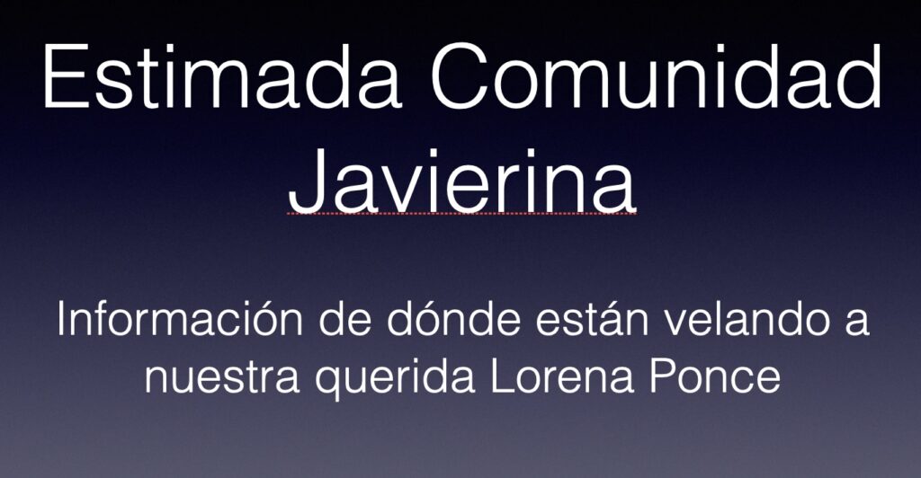 Comunicamos con profundo pesar el fallecimiento de nuestra Presidenta del Centro de Padres Javiera Carrera, Sra. Lorena Ponce. Como comunidad Javierina expresamos nuestras más sinceras condolencias a su familia. En el curso de mañana informaremos del velatorio para quienes quieran acompañarla en su partida.