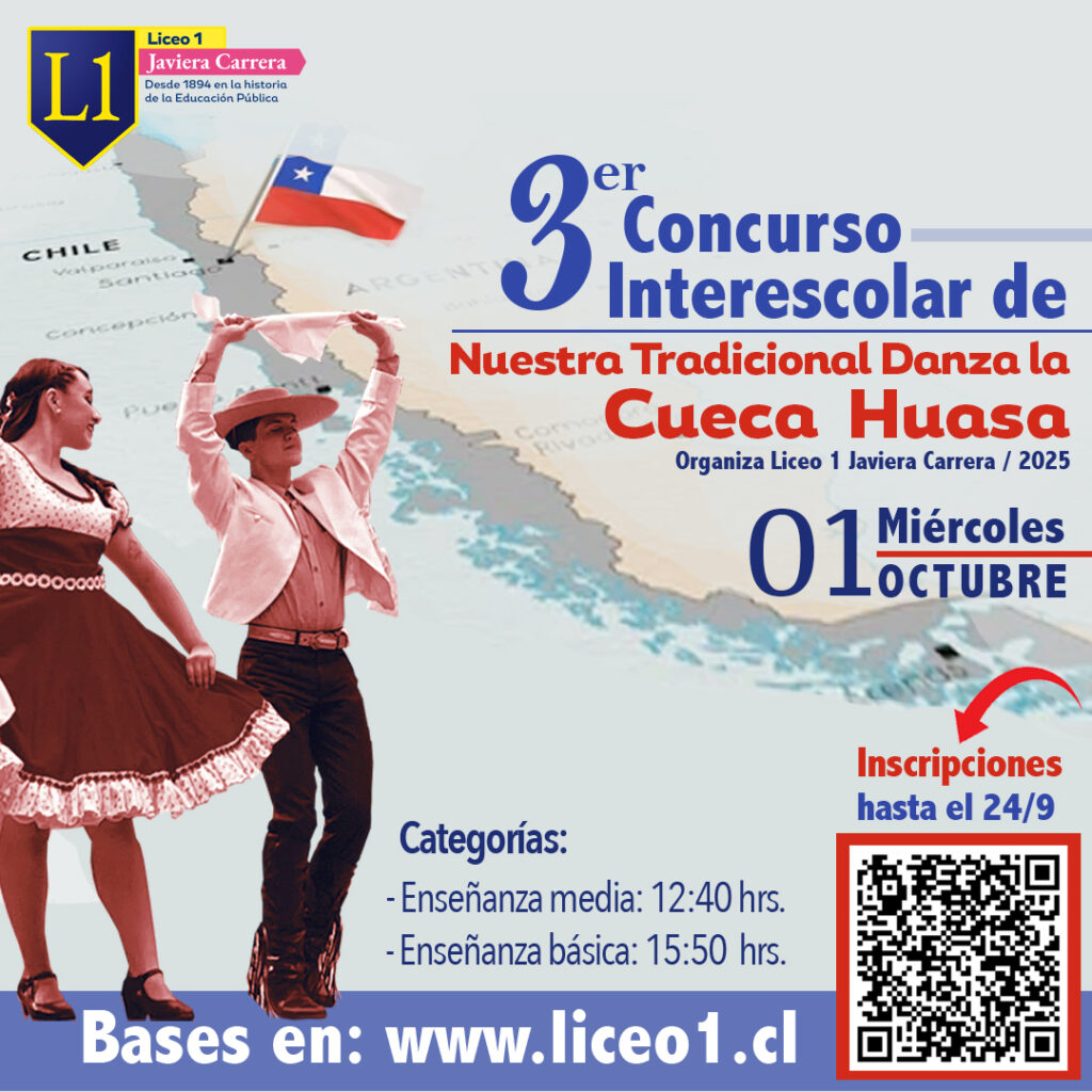 El Liceo N°1 Javiera Carrera tiene el agrado de invitarles a participar en el 3° Concurso Interescolar de Nuestra Danza Tradicional: La Cueca Huasa.