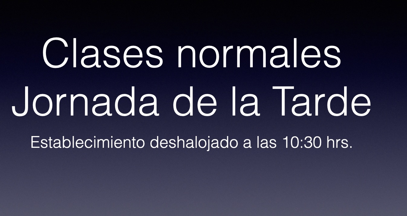 Informamos que, a las 10:30 de la mañana de hoy jueves 30 de octubre, ha sido desalojado el establecimiento sin estudiantes al interior y el Liceo se encuentra en buenas condiciones.