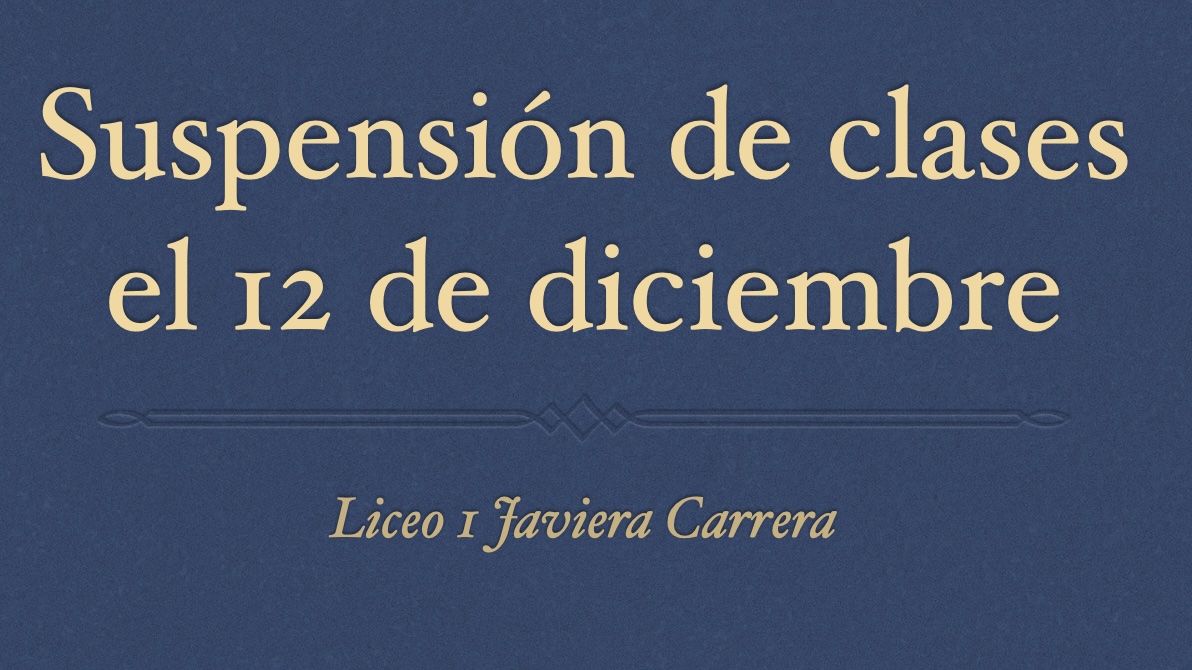 les informamos que el día 12 de diciembre se suspenden las clases, ya que nuestro establecimiento es sede de votación presidencial. El día lunes se retoman las actividades académicas a las 10:00 de la mañana para la Jornada Mañana y a las 14:30 hrs para la Jornada de la Tarde.