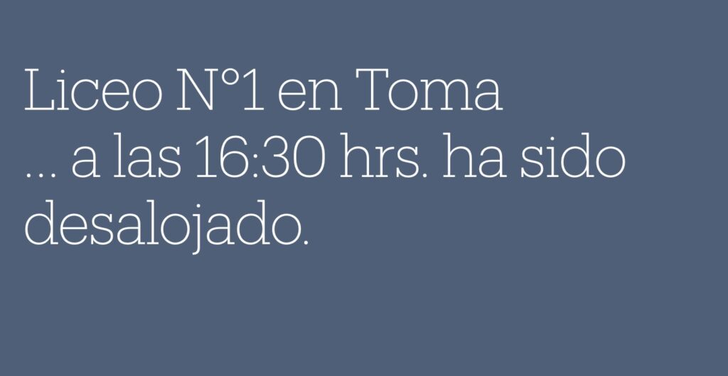 Estimada comunidad,  Informamos que hoy el Liceo estaba tomado a las 5:30 de la mañana, por ello se suspenden las clases en ambas jornadas.  Cualquier nueva información la comunicaremos por los medios oficiales.  Atte., Dirección del Establecimiento