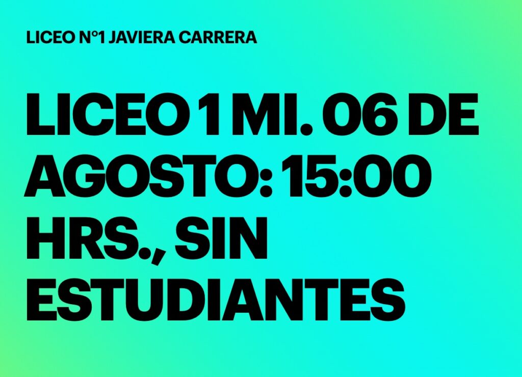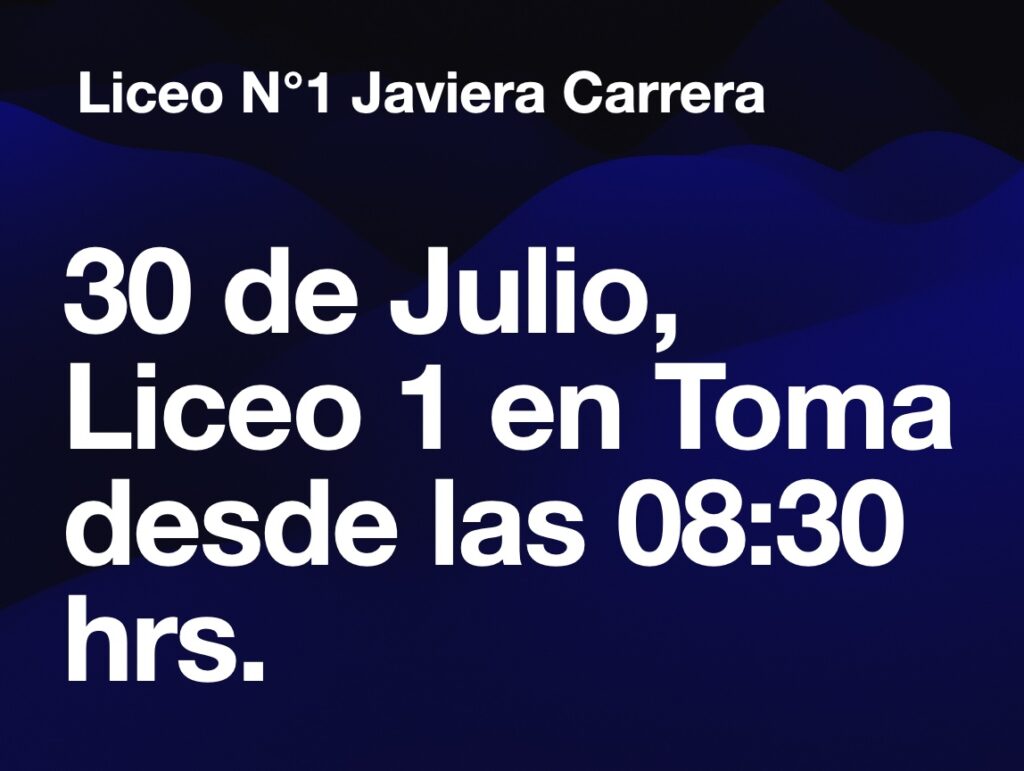 Debido a la toma del establecimiento la jornada de la tarde se suspende por el día de hoy.  Se actualizará la información por medio de los canales oficiales.  Atte  Andrea Céspedes Iturriaga Subdirectora Liceo N° 1 Javiera Carrera