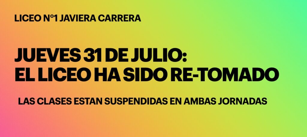 SANTIAGO, julio 29 de 2025 Estimada comunidad: En virtud de los acontecimientos recientes en el establecimiento, resulta fundamental precisar el contexto actual: el día viernes 25 de julio se inició una toma estudiantil en el Liceo, la cual fue desalojada ese mismo día a las 16:00 horas. Desde entonces, esta situación se ha reiterado, generando…