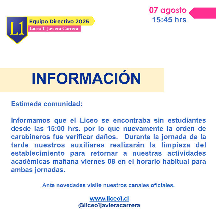 Estimada comunidad: Informamos que el Liceo se encontraba sin estudiantes desde las 14:30 hr por lo que nuevamente la orden de carabineros fue verificar daños.  Durante la jornada de la tarde se realizará la limpieza del establecimiento para retornar a nuestras actividades académicas el dia lunes 4 de agosto en el horario habitual para ambas…